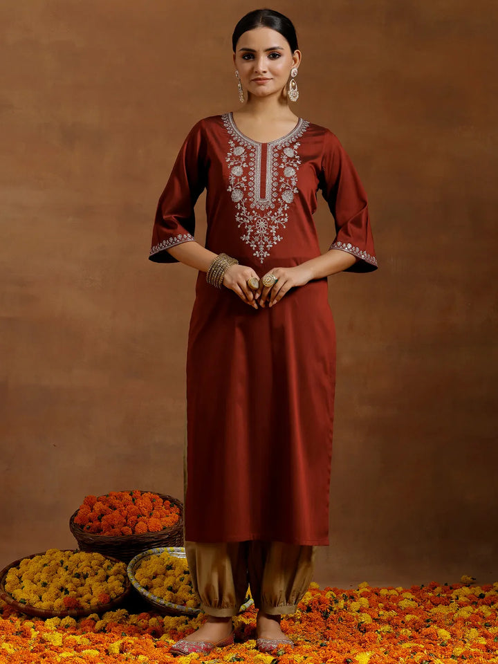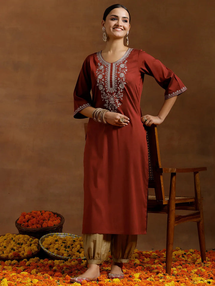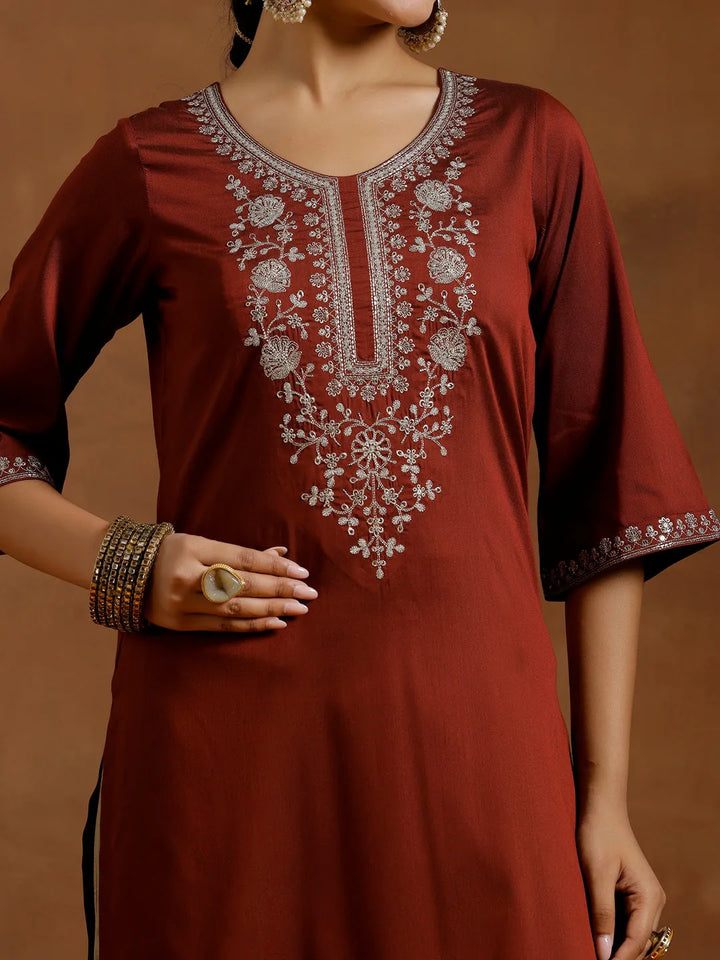 Our maroon embroidered silk straight kurta features a round neckline, three-quarter flared sleeves, and a statement yoke. Highlighted with intricate thread work and sequins, this style is perfect for light festivities.