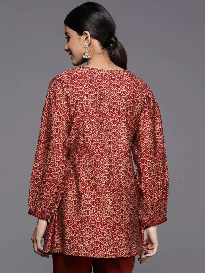 Our maroon red printed peplum short kurti, crafted in sumptuous silk blend fabric, features a U-notched neckline, full bishop sleeves, and a statement yoke. Adorned with delicate piping and fabric-trim accents, this comfortable style is ideal for work and beyond.