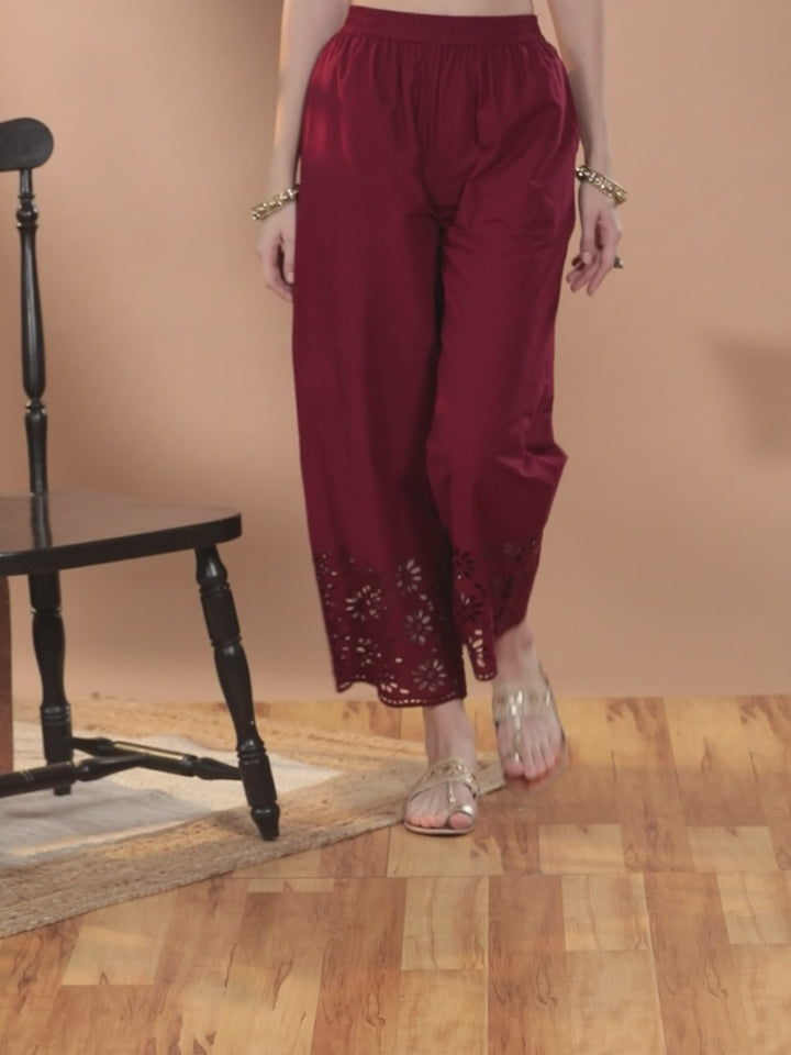 Our maroon woven palazzos, made of cotton fabric, feature a partially elasticated waistband, and roomy pockets. This refreshing style is perfect for elevated everyday wear.