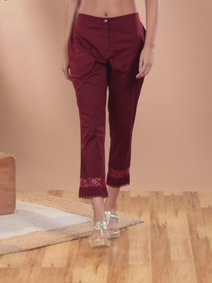 Our maroon cotton woven trousers feature a partially elasticated waistband, flat-front with no pleats design, and mid-rise waist style with roomy pockets. Adorned with an elegant hem design and fine lace accents, this intricate style is perfect for festive celebrations.