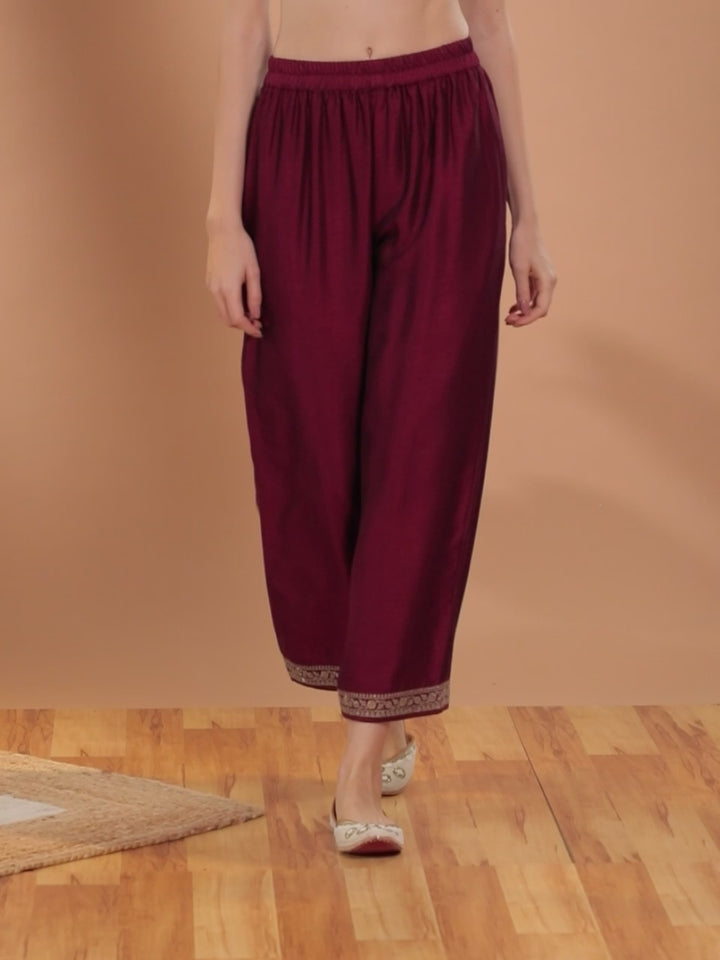 Our maroon woven chic palazzo pants, made of silk fabric, feature a partially elasticated waist with a slip-on closure and straight fit. Adorned with an elegant hem and fine embroidered edges, this refreshing style is perfect for festivities.