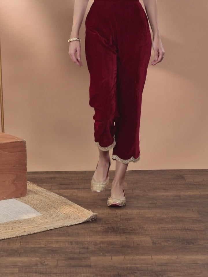 Our maroon solid velvet trousers feature a partially elasticated waistband, 2 roomy pockets and a loose-fit mid-rise waist style. Adorned with scalloped mirror lace, this refreshing style is ideal for light festivities.