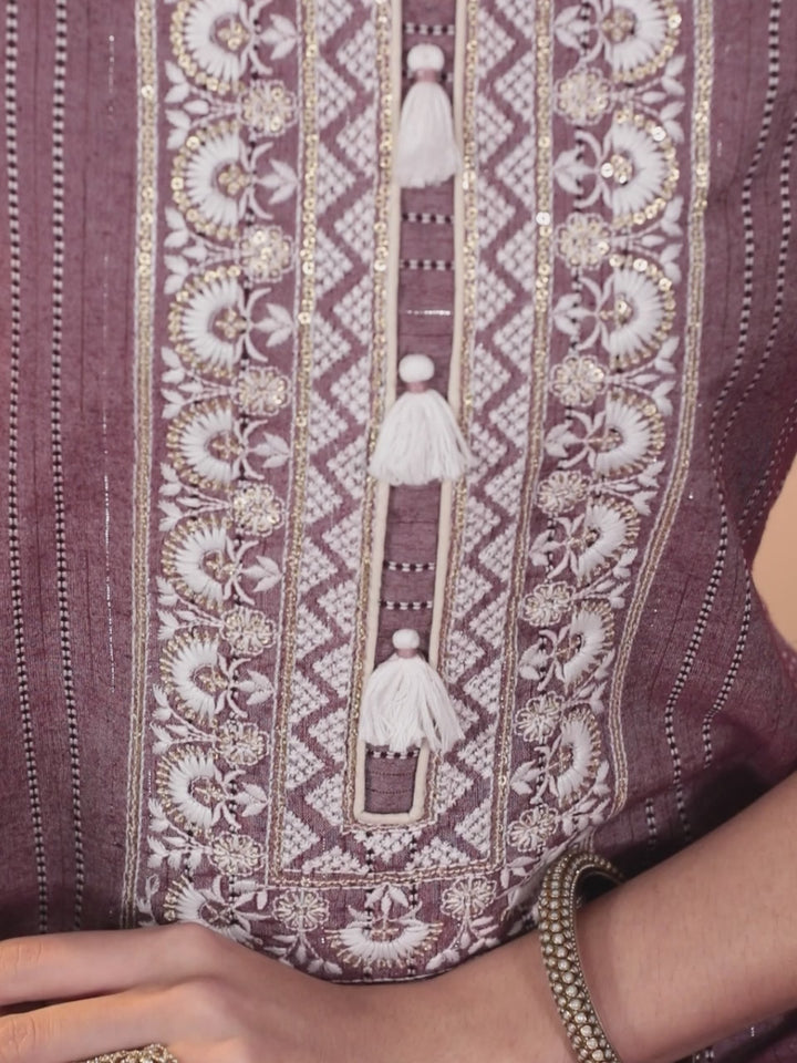 Our mauve straight-fit kurta, made of lightweight cotton fabric, features a notched neckline, three-quarter sleeves, and a statement yoke. Adorned with handcrafted tassels, delicate sequins detailing, lace, fabric and piping trim accents, this refreshing style is ideal for light festivities.
