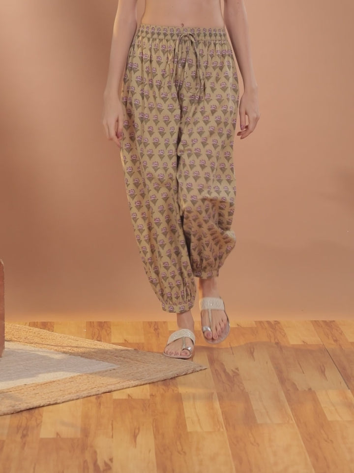 Our beige cotton salwar features an elasticated waistband with drawstrings and pleated details. Adorned in an olive green floral print and cuffed hem, this intricate style is perfect for casual outings.