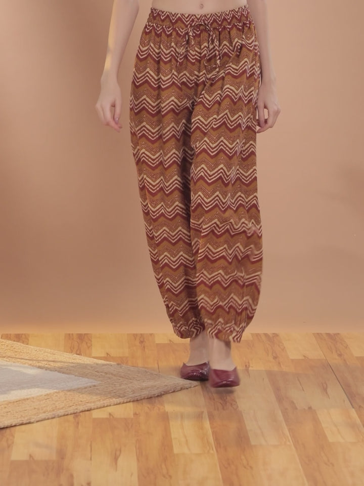 Our mustard brown cotton salwar features an elasticated waistband with drawstrings and pleated details. Adorned in a rust chevron print and cuffed hem, this intricate style is perfect for casual outings.