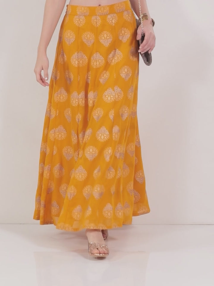 Our mustard floral brocade polyester skirt features a flared hemline, gold foil ethnic motifs, a partially elasticated waistband with slip-on closure. This elegant style is perfect for elevated everyday wear.