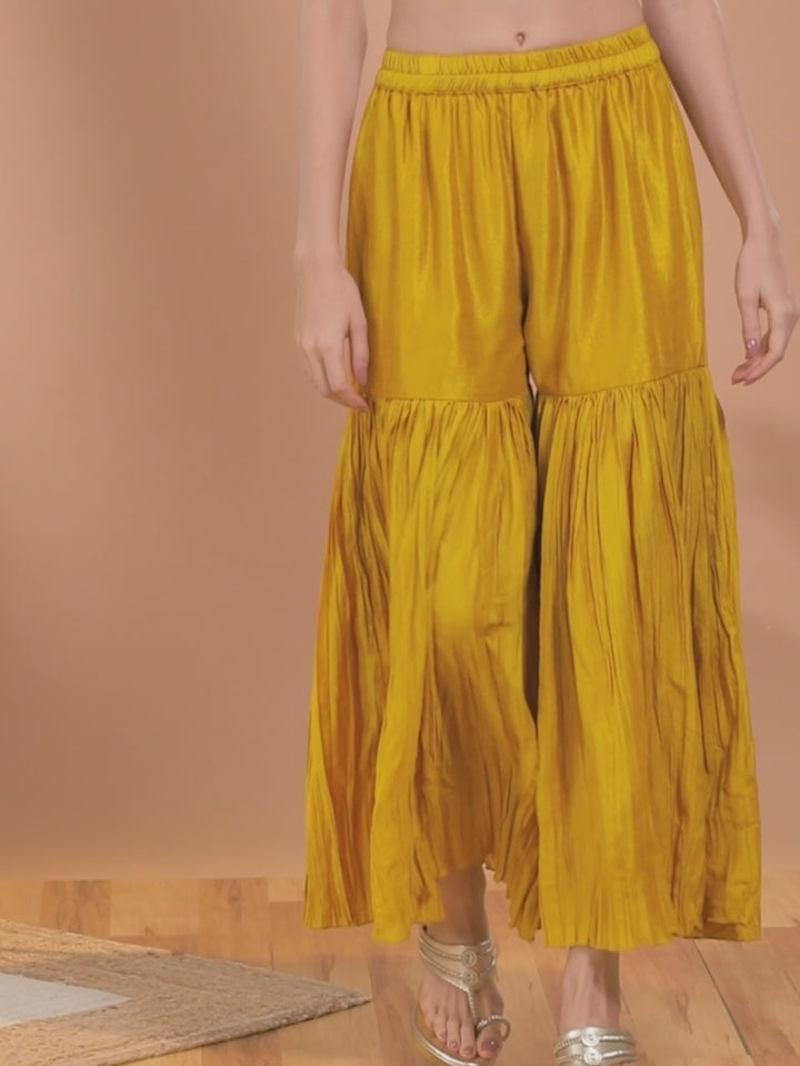 Our mustard woven chic palazzo pants, made of silk fabric, feature a partially elasticated waist with a slip-on closure and flared fit. This refreshing style is perfect for festivities.