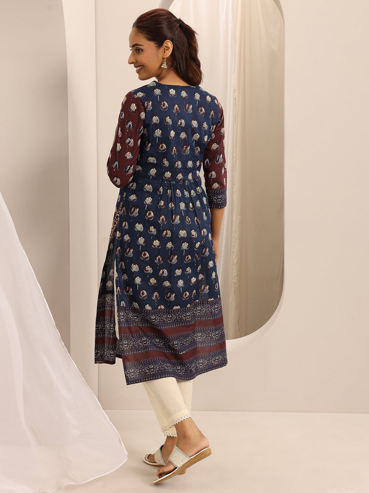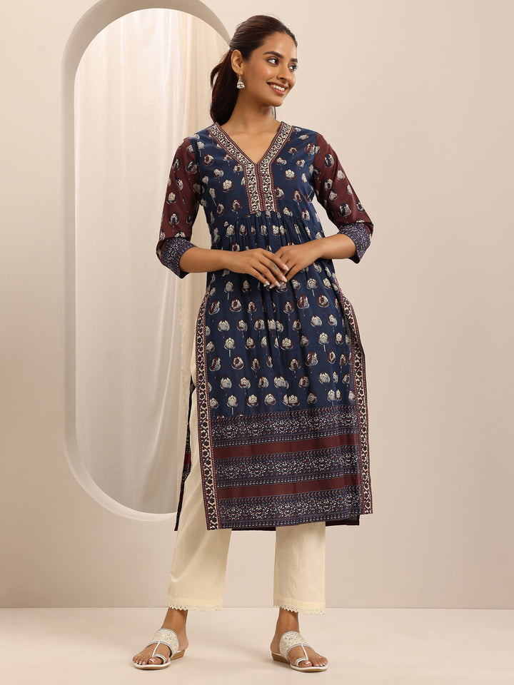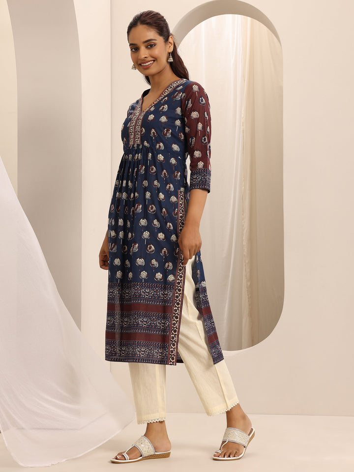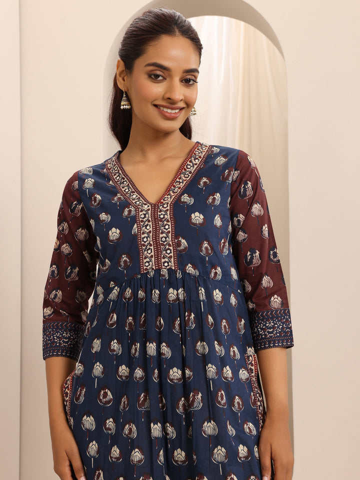 Our 1-piece navy blue cotton A-line kurta features a V-neckline, regular sleeves and statement Yoke. Adorned with Ajrakh Printed, this style is perfect for casual wear.