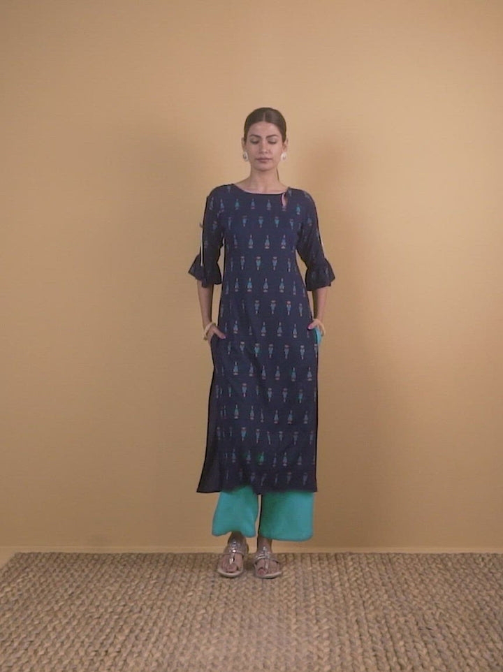Our navy blue printed rayon kurta features a keyhole neckline and three-quarter bell sleeves. Adorned with captivating ethnic motifs print, slit sleeves, and dori and tassel detailing, this style is perfect for casual outings.
