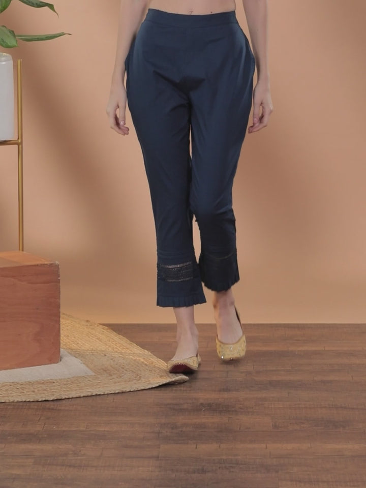 Our navy blue cotton woven trousers feature a partially elasticated waistband, flat-front with no pleats design, and mid-rise waist style with roomy pockets. Adorned with an elegant hem design and fine lace accents, this intricate style is perfect for festive celebrations.