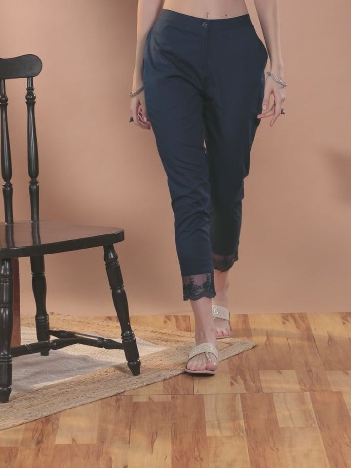 Our navy blue straight woven trousers, made of cotton fabric, feature a relaxed straight leg, flat-front with no pleats design, lace details, and two roomy pockets. This refreshing style is perfect for festive celebrations.