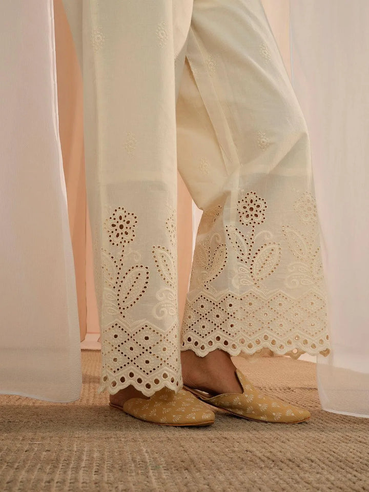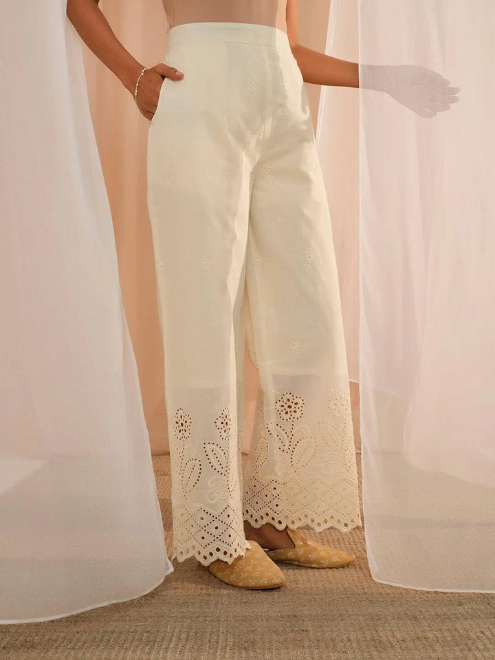Our off-white palazzo pants feature a partially elasticated waistband and roomy pockets. Elevated with cutwork, thread work, and schiffli detailing, this style is perfect for casual outings.