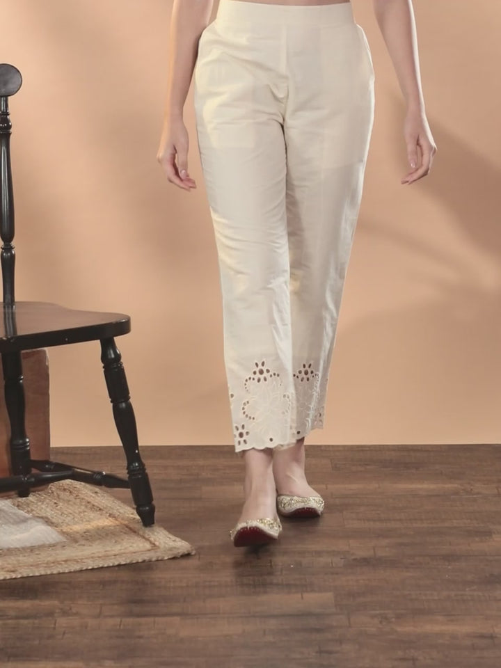 Our off-white solid tone straight-fit trouser pants, made of lightweight cotton fabric, feature a partially elasticated waistband and roomy pockets. Adorned with intricate schfilli and scalloped detailing, this charming style is perfect for casual outings.