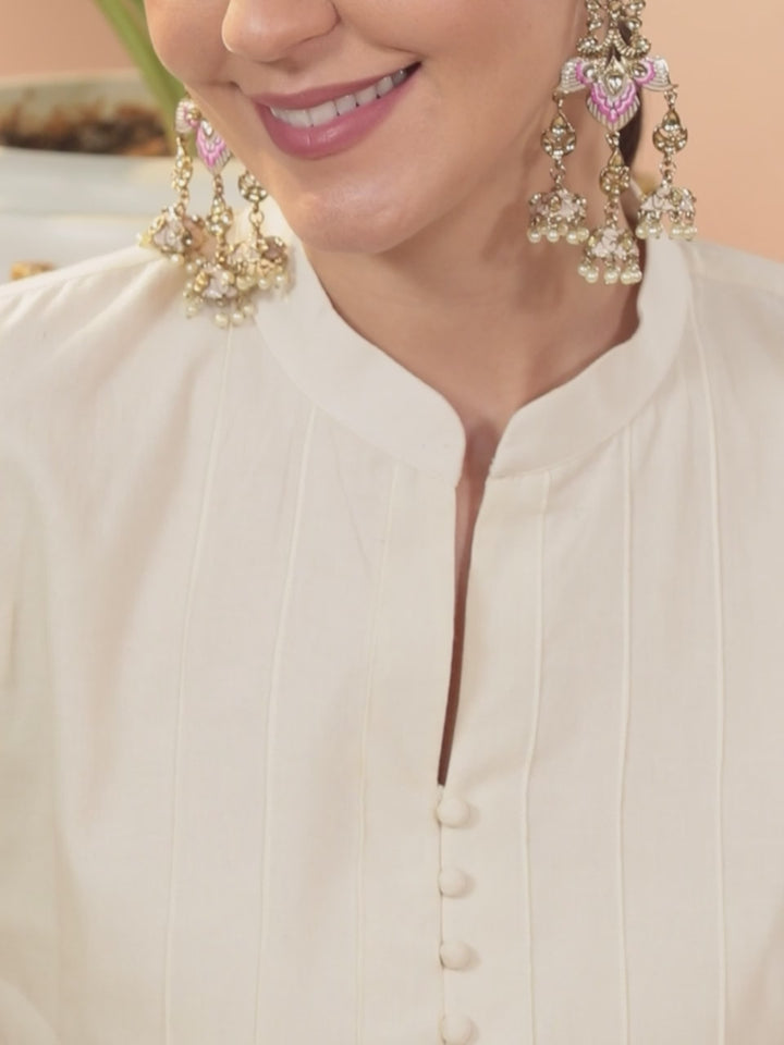 Our off-white cotton straight-fit kurta features a mandarin collar, and three-quarter flared sleeves. This elegant style is perfect for elevated everyday wear.