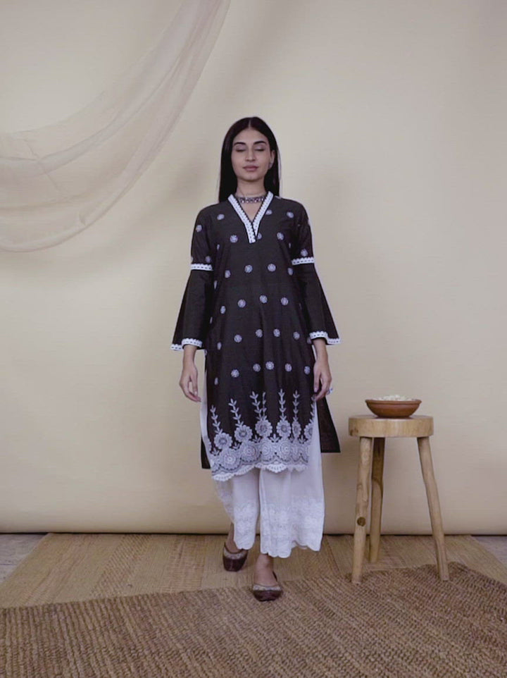 Decorated with delicate Schiffli embroidery, our olive straight cut kurta features floral embroidered motifs and intricate lace detailing on the neckline and sleeves.