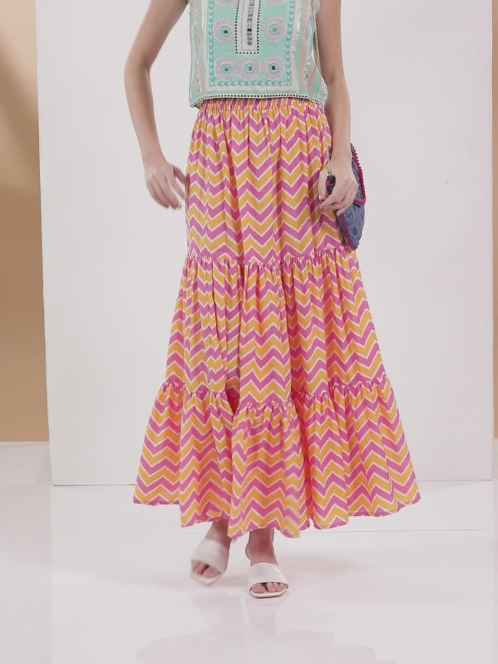 Our orange cotton skirt features a maxi skirt with a partially elasticated waistband and pleated details. Adorned in a chevron print, this intricate style is perfect for festivities.
