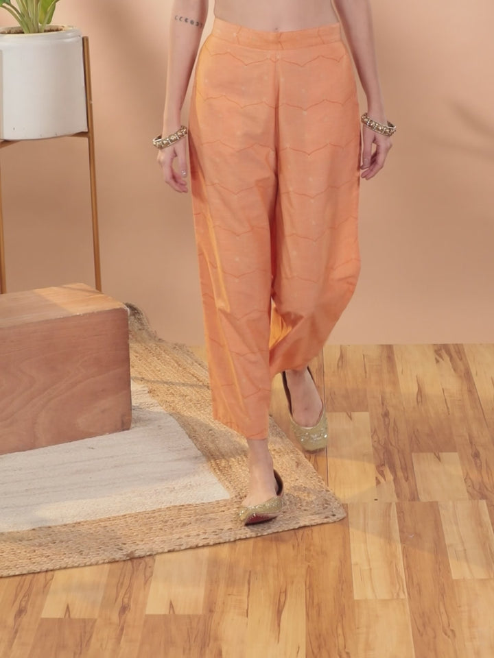 Our orange woven silk straight palazzo pants feature a partially elasticated waistband and roomy pockets. Adorned with delicate gilded accents, this elegant style is perfect for light festivities.