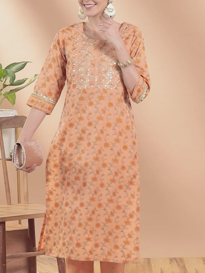 Our orange cotton silk straight-fit kurta features ethnic motifs yoke design, a round neck, and three-quarter regular sleeves. Adorned with sequinned detailing, this graceful style is perfect for festive celebrations.