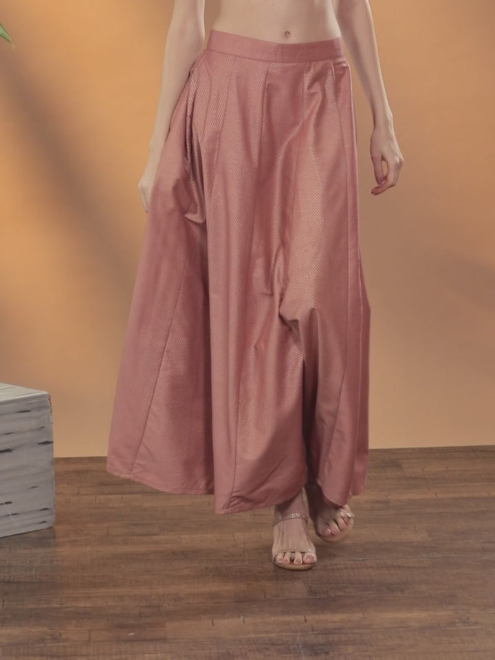 Our peach plus size woven silk skirt features a solid A-line maxi skirt with a partially elasticated waistband and slip-on closure. Adorned in a flared hemline, this intricate style is perfect for festivities.
