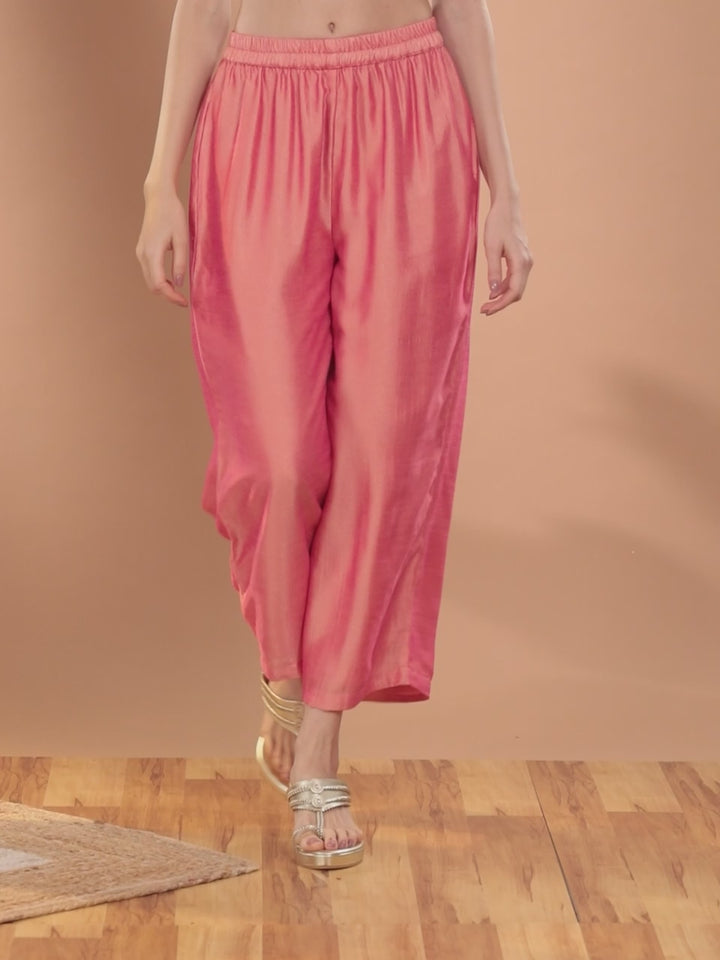 Our peach woven chic palazzo pants, made of silk fabric, feature a partially elasticated waist with a slip-on closure and roomy pockets. This refreshing style is perfect for casual outings.