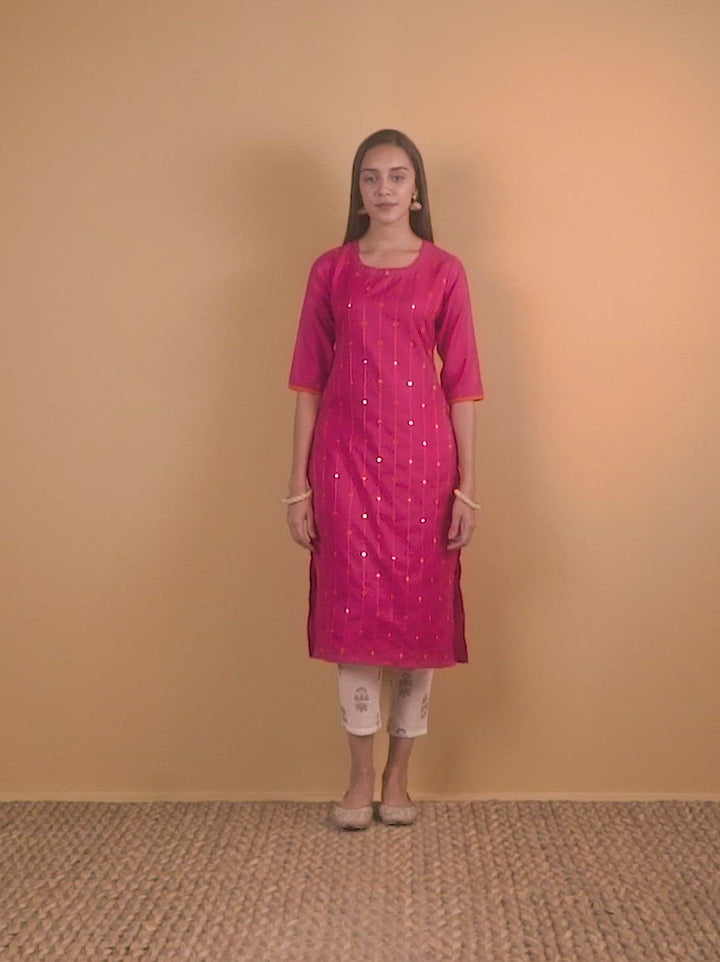 Our pink straight-fit cotton kurta features a round neckline and three-quarter sleeves. Adorned with delicate thread-work and mirror accents, this elegant style is ideal for daytime festivities.