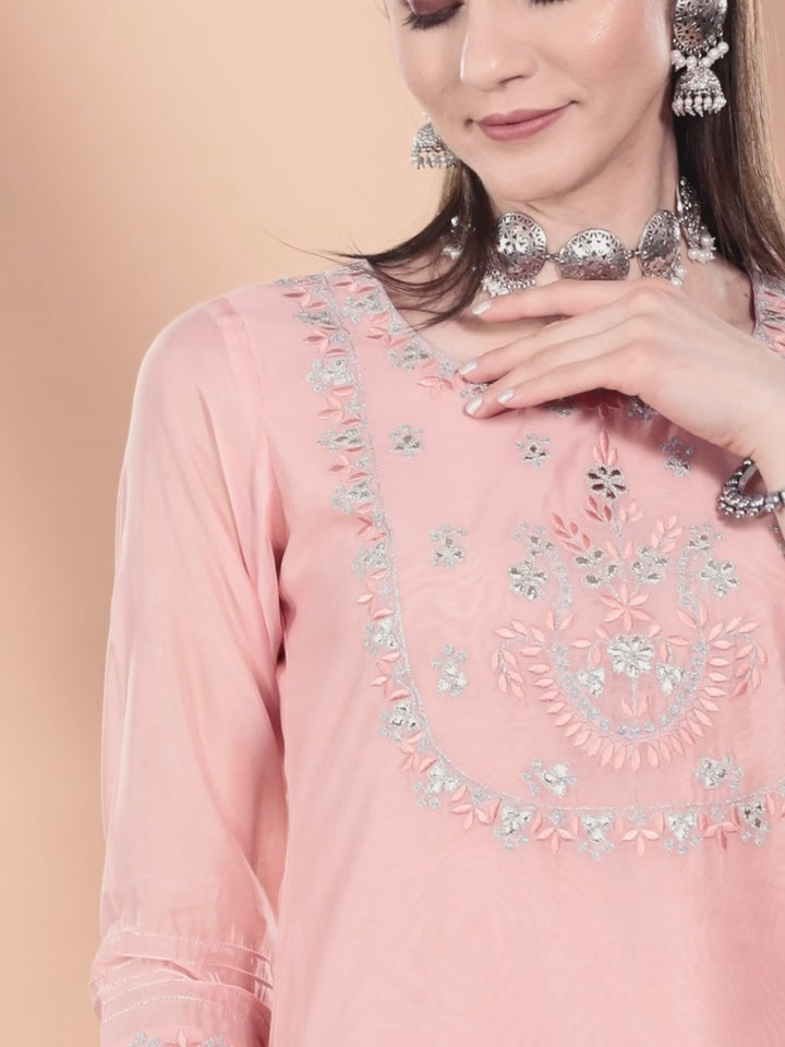 Our pink solid tone straight-fit chanderi silk kurta features a round neckline, three-quarter sleeves, and a statement yoke. Elevated with intricate floral embroidery, delicate Gota Patti and fabric-trim accents, this refreshing style is perfect for daytime festivities.