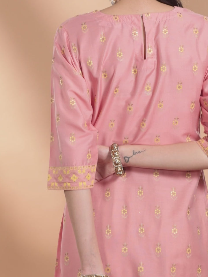 Our pink Chanderi silk straight-fit kurta features a floral print, a round neckline, and three-quarter regular sleeves. This graceful style is perfect for festive celebrations.