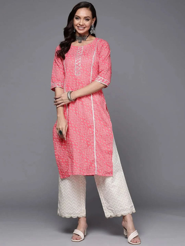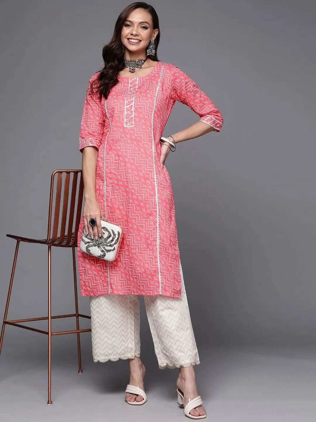 Our pink Bandhani print straight-fit cotton kurta features a round neckline and three-quarter sleeves. Adorned with delicate Gota Patti accents, this bright piece is best suited for summer outings.
