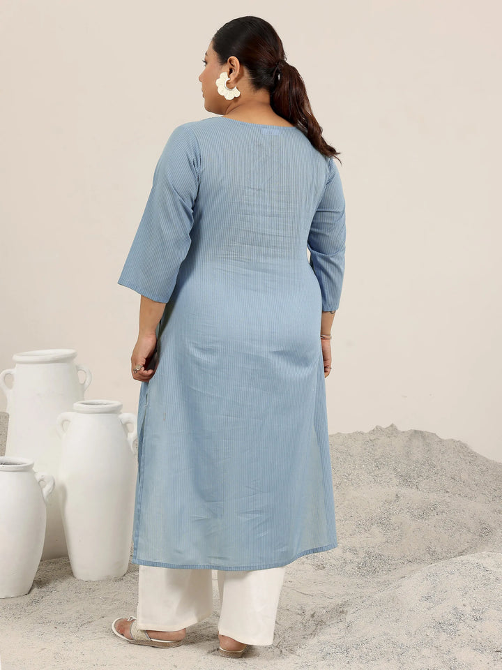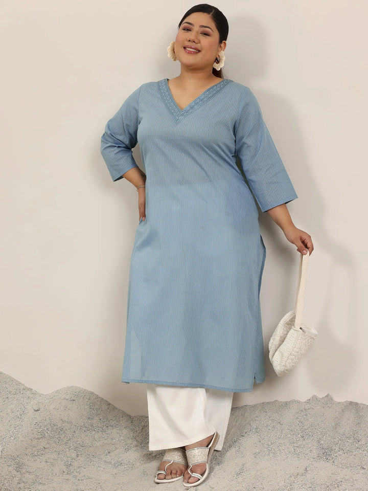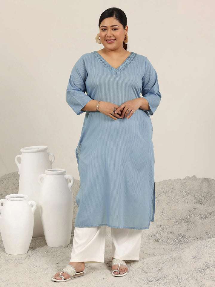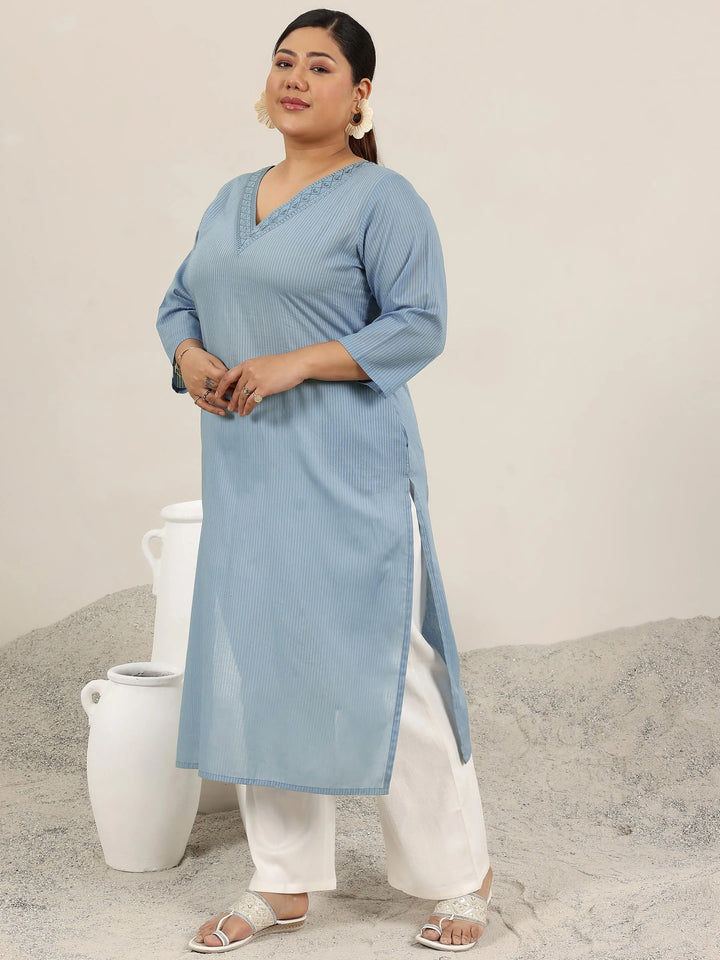 Libas Extra Love collection features our signature designs in comfortable plus sizes. Our blue cotton straight kurta features a V-neckline and three-quarter sleeves. Highlighted with intricate thread work, this style is perfect for work and beyond.