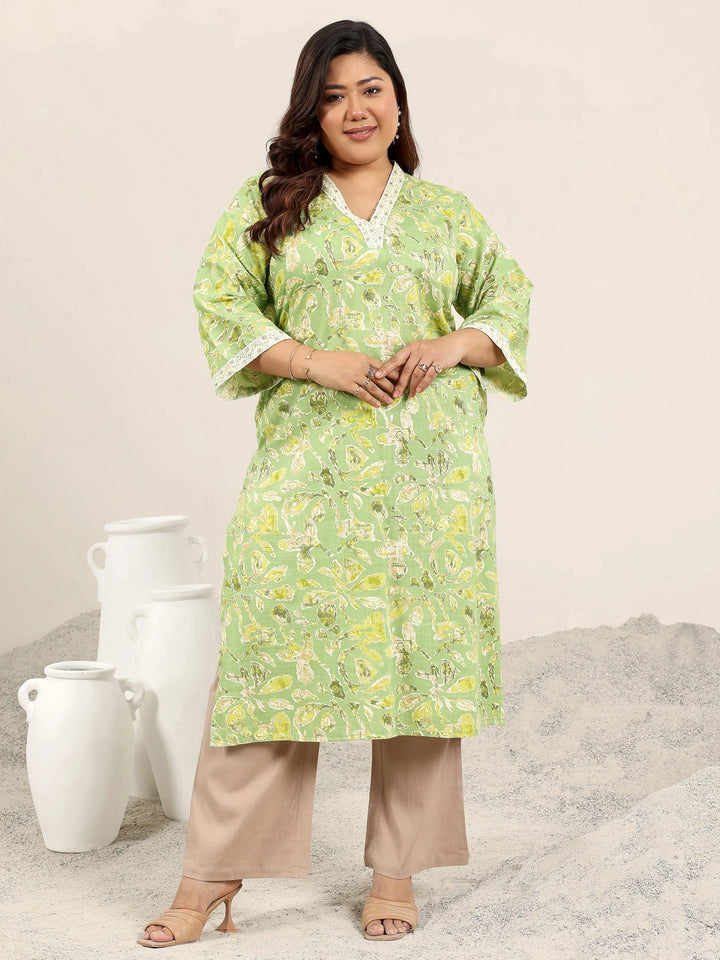 Libas Extra Love collection features our signature designs in comfortable plus sizes. Our green printed cotton straight kurta features a V-neckline and three-quarter flared sleeves. Highlighted with lace detailing, this style is perfect for casual outings.