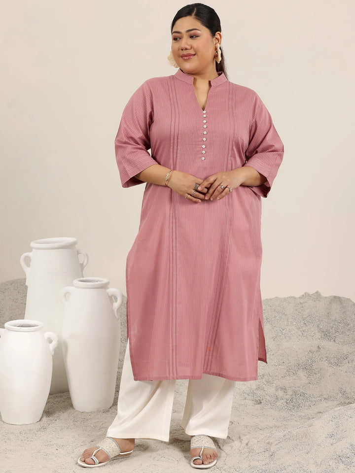 Libas Extra Love collection features our signature designs in comfortable plus sizes. Our mauve cotton printed straight kurta features a mandarin-notched neckline and three-quarter sleeves. Highlighted with a striped pattern and stylish buttons, this style is perfect for daytime festivities.