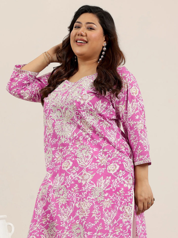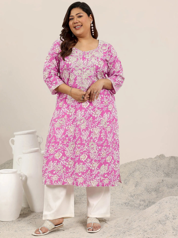 Libas Extra Love collection features our signature designs in comfortable plus sizes. Our pink cotton printed straight kurta features a round neckline, three-quarter sleeves and a statement yoke. Highlighted with floral prints, roomy pockets, fabric-trim accents and thread work, this refreshing style is perfect for casual outings.