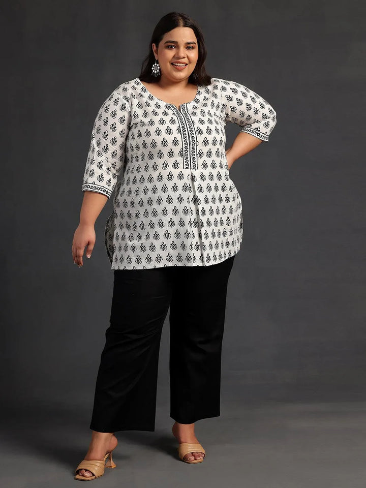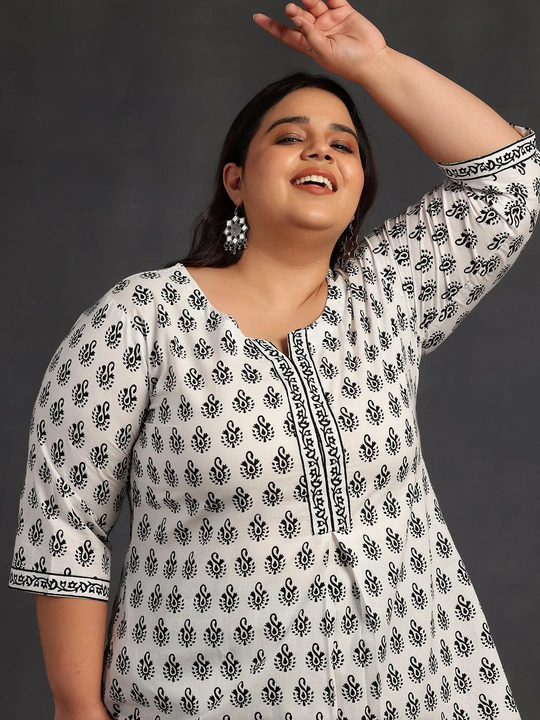 Libas Extra Love collection features our signature designs in comfortable plus sizes. Our white printed short straight-fit kurti, crafted in cotton fabric, features a notched neckline and three-quarter sleeves. Adorned with ethnic motifs print and fabric-trim accents, this style is perfect for casual outings.