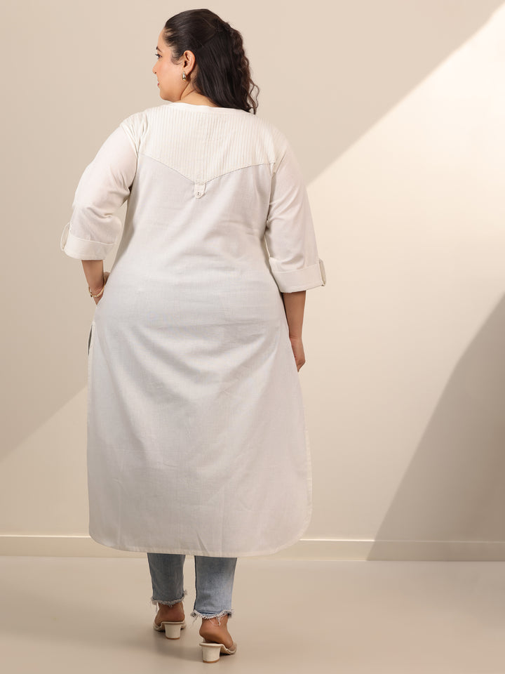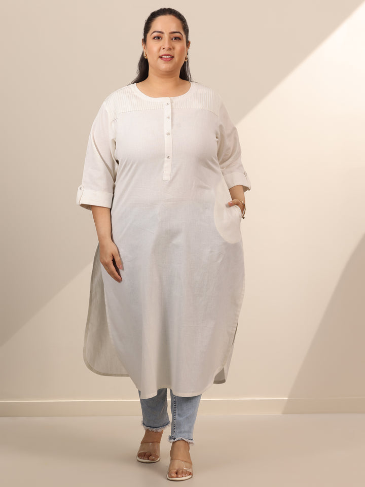 Libas Extra Love collection features our signature designs in comfortable plus sizes. Our 1-piece off white cotton blend straight-fit kurta features a round neckline, roll-up sleeves, and statement Yoke. Adorned with solid, this style is perfect for casual wear.
