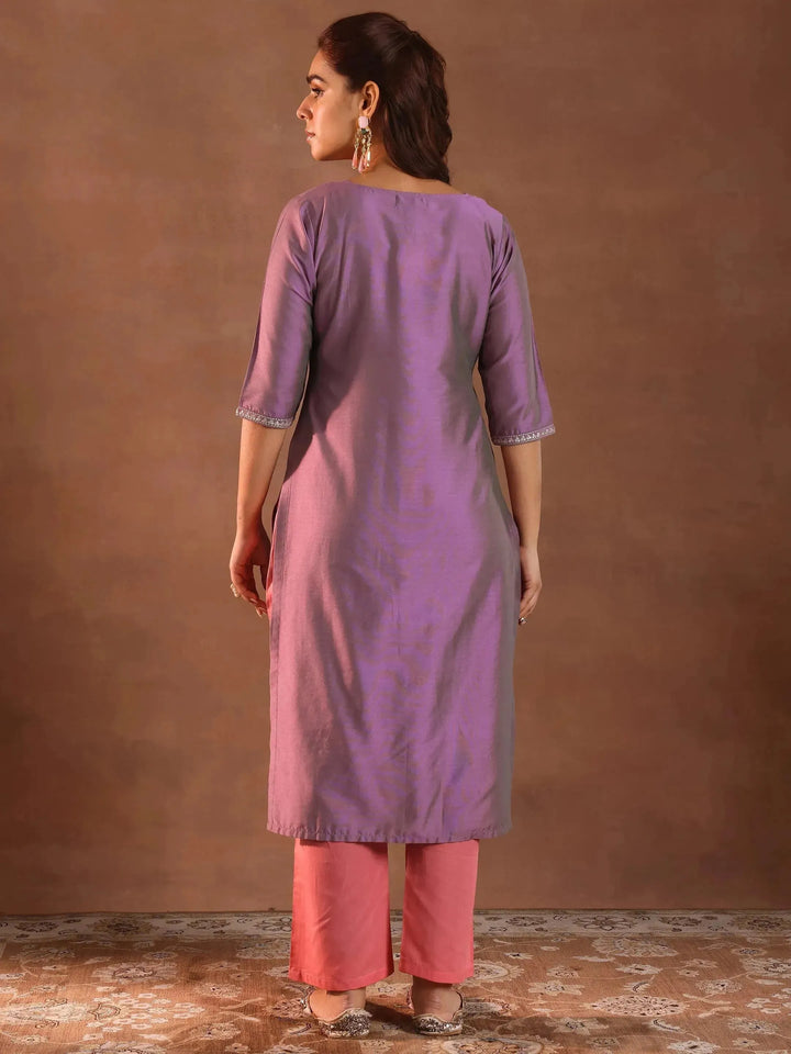 Our 1-piece purple silk straight-fit kurta features a round neckline, regular sleeves, and statement yoke. Adorned with none, this style is perfect for festive occasions.