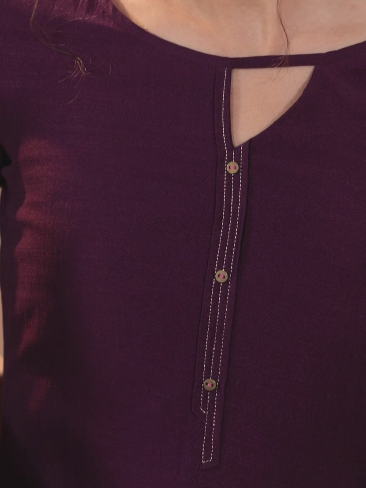 Our purple straight-fit kurta, crafted in soft silk fabric, features a cutout detailed neckline and three-quarter sleeves. Adorned with threadwork detailing, this comfortable style is ideal for festivities.
