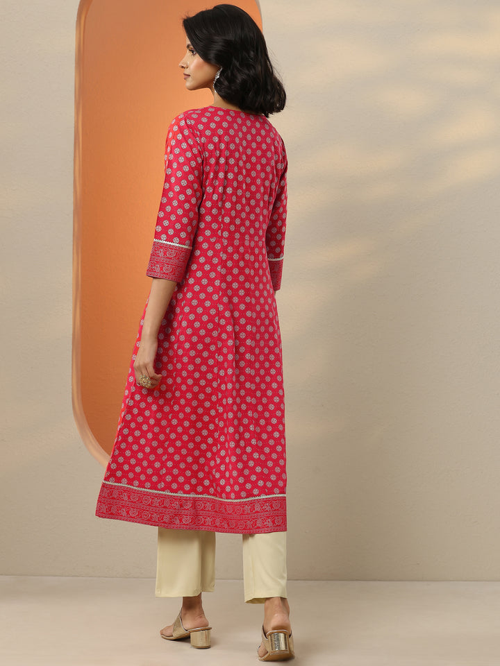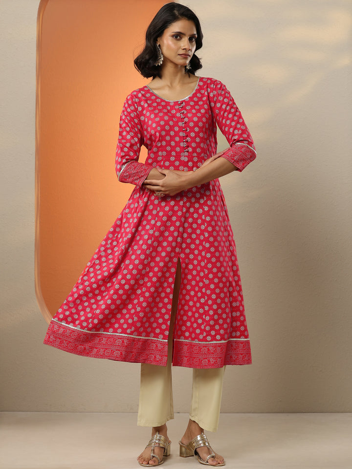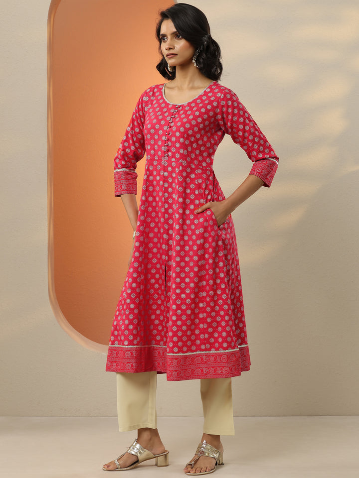 Our red floral print A-line kurta, crafted in soft rayon fabric features a round neckline, three-quarter sleeves, roomy pockets, and a stylish front-slit. Elevated with handmade fabric buttons, delicate fabric-trim accents, and Gota Patti detailing, this elegant style is ideal for light festivities.