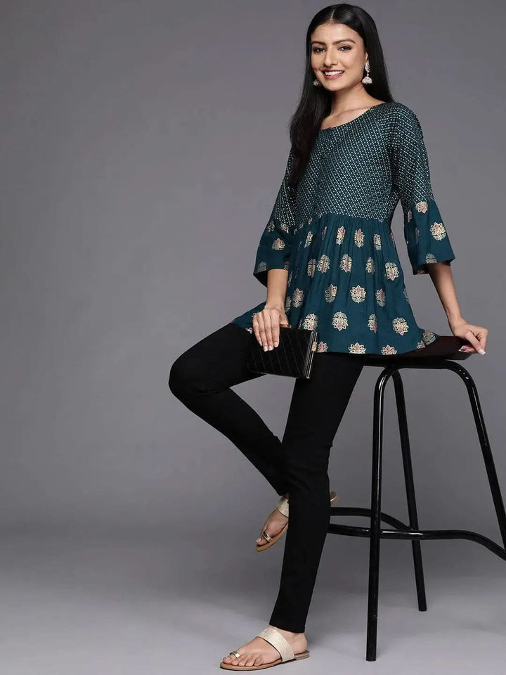 Our teal blue floral print short kurti, crafted in soft rayon fabric features a round neckline, three-quarter bell sleeves, and a flared hemline. Highlighted with handcrafted fabric buttons, this charming style is ideal for casual outings.