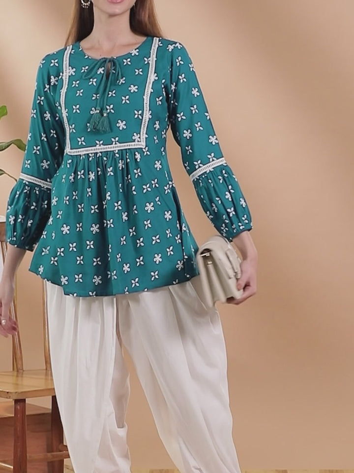 Teal Printed Rayon Kurti