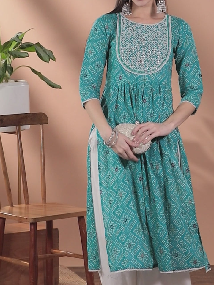 Our turquoise blue straight-fit Bandhani inspired print straight-fit kurta, made of lightweight cotton fabric, features a round neckline, three-quarter sleeves, stylish high-slits, and a statement yoke. Adorned with handcrafted tassels, mirror-work detailing, intricate thread-work, sequins and lace-trim accents, this refreshing style is ideal for light festivities.