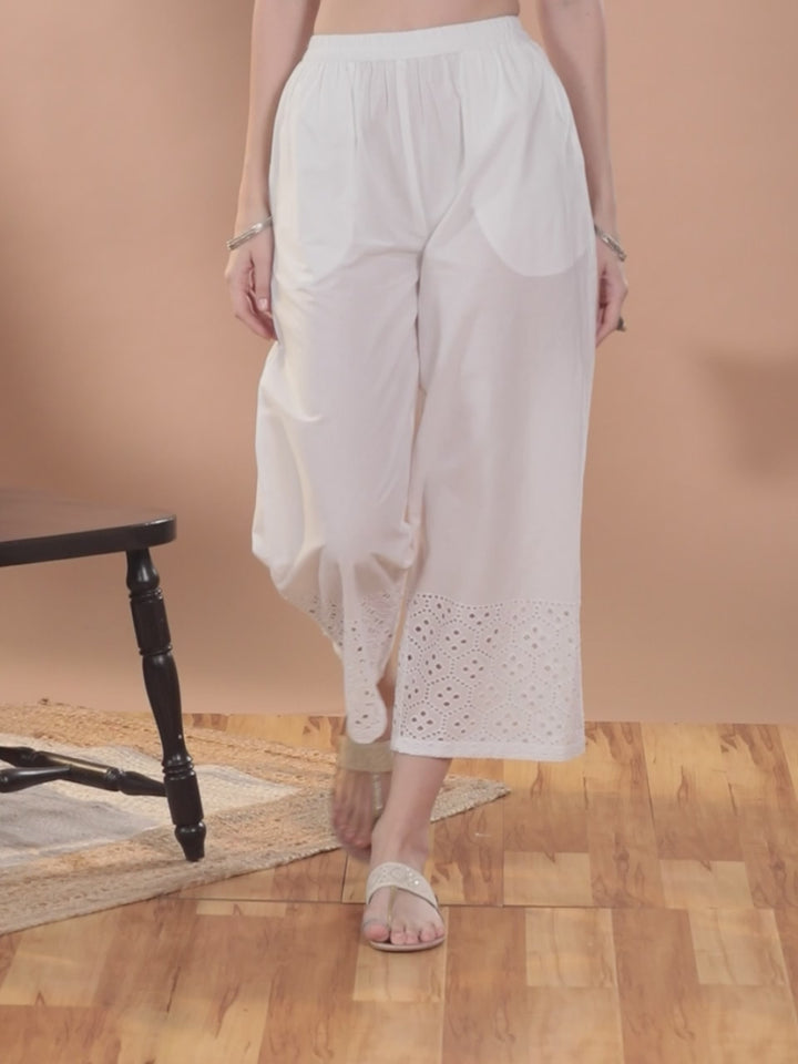 Our white woven palazzos, made of cotton fabric, feature a partially elasticated waistband, and roomy pockets. Adorned with geometric hem design, this style is perfect for casual outings.