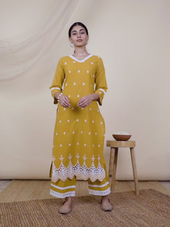 Decorated with delicate Schiffli embroidery, our yellow straight cut kurta features floral embroidered motifs and intricate lace detailing on the neckline and sleeves.