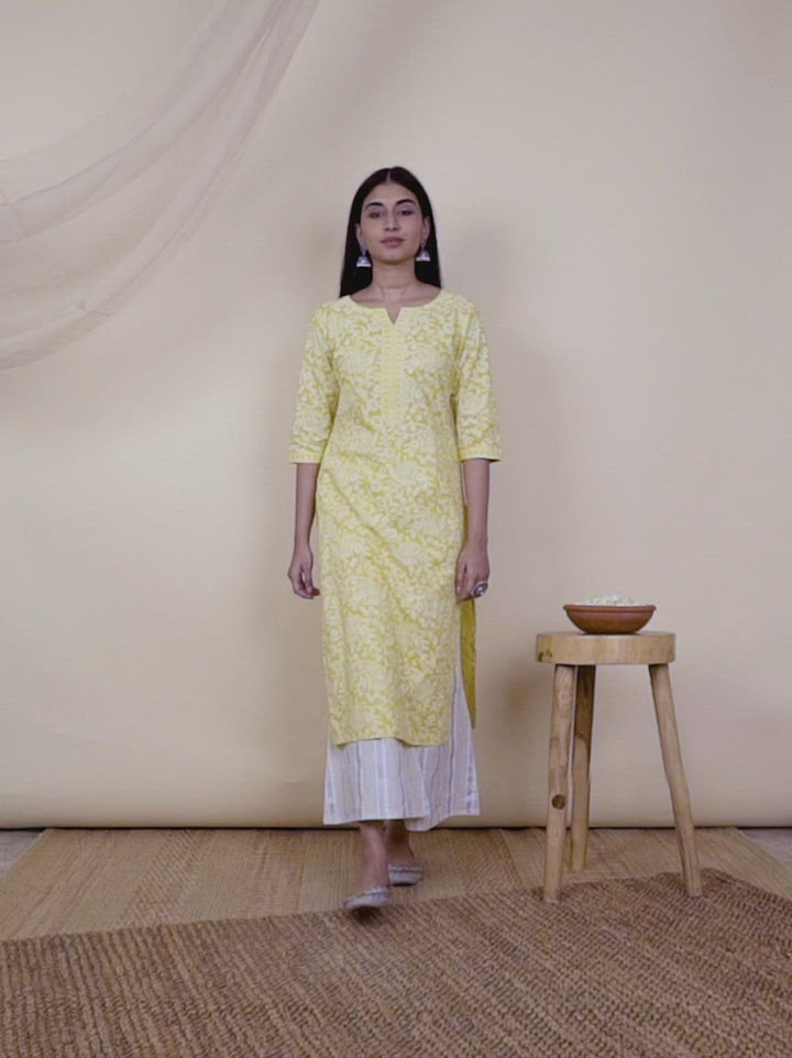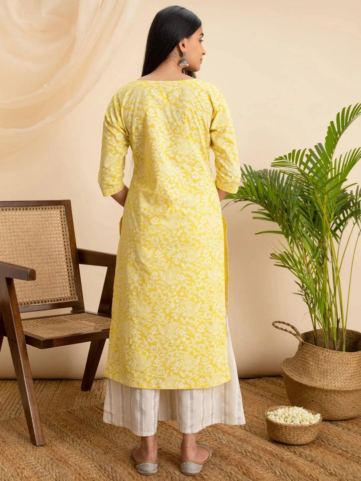 Our yellow straight-fit floral print cotton kurta features a notched neckline and three-quarter sleeves. Elevated with complementing fabric-trim accents, this comfortable style is ideal for effortless everyday wear.