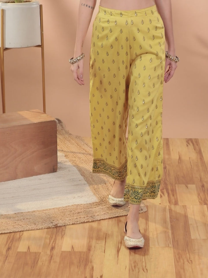 Our yellow silk blend straight palazzo pants feature a partially elasticated waistband and roomy pockets. Adorned with an ethnic motif print and Gota Patti hem design, this refreshing style is perfect for light festivities.