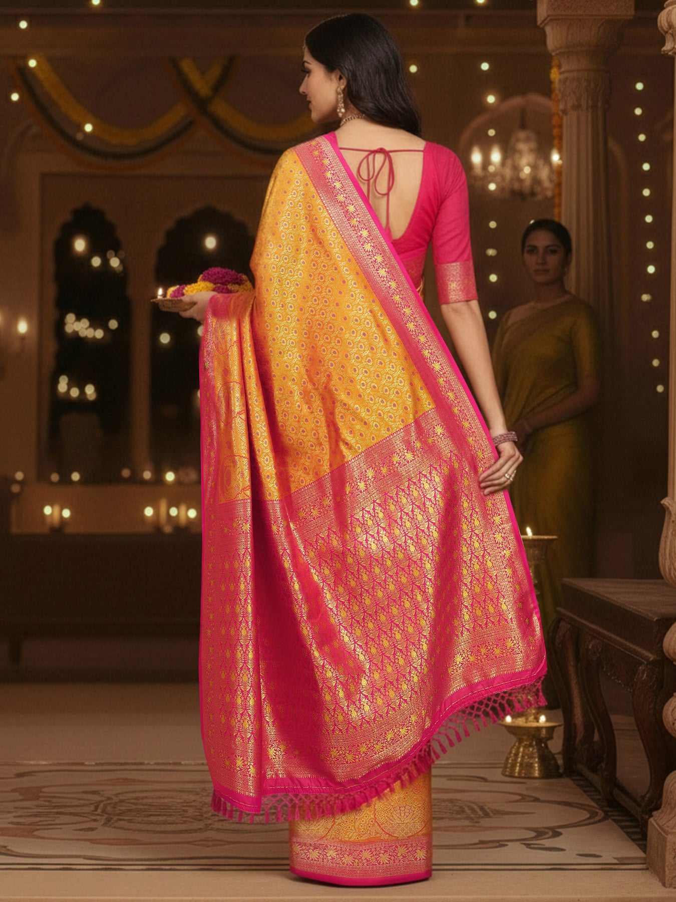 Our msutard Silk blend saree features captivating woven design. Complemented with an unstitched blouse piece. This charming saree is perfect for festive occasions.