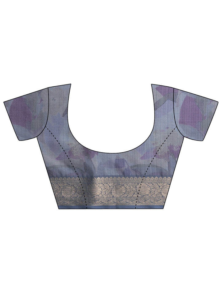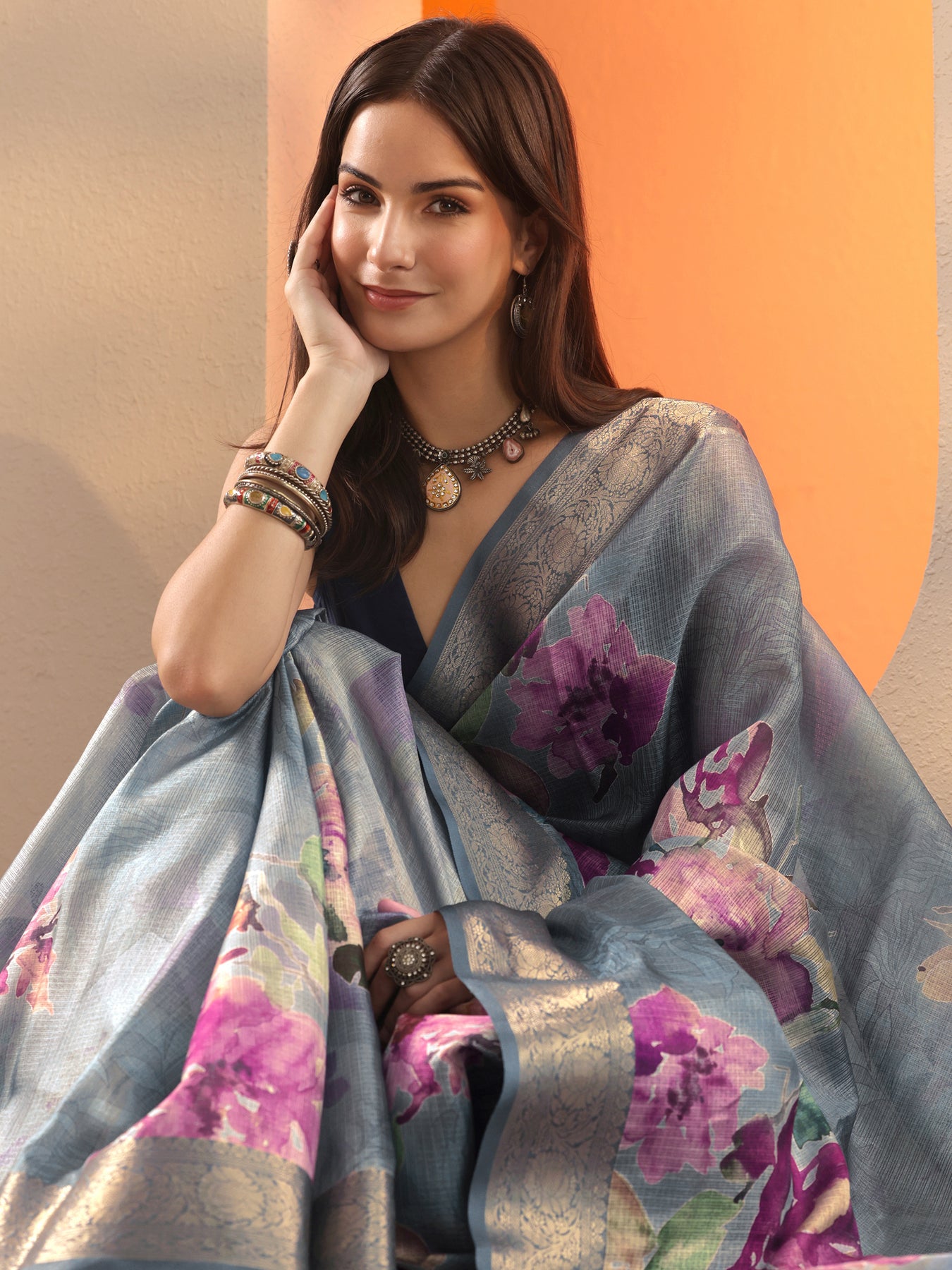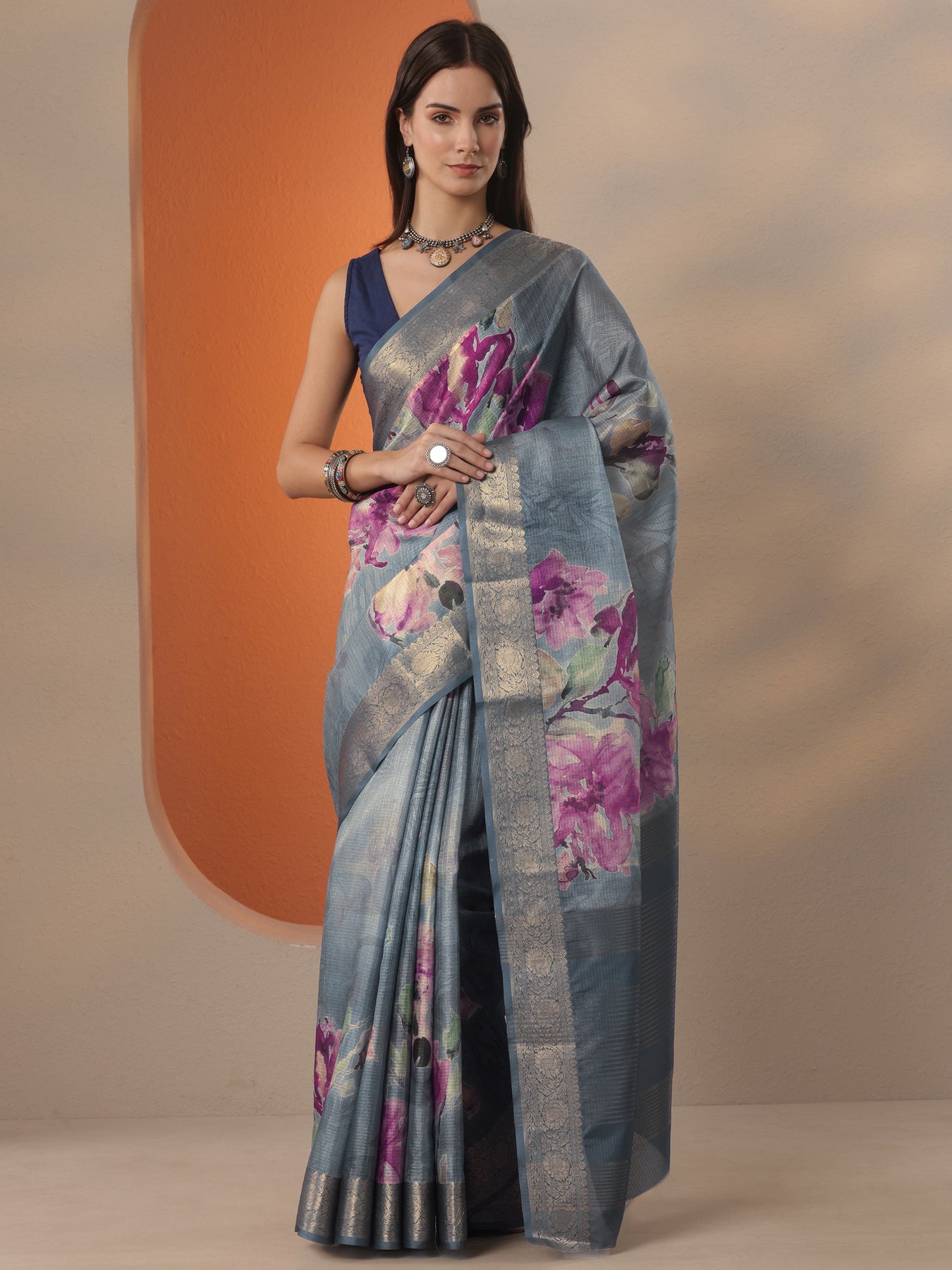 Grey Printed Kota Saree With Unstitched Blouse Piece
