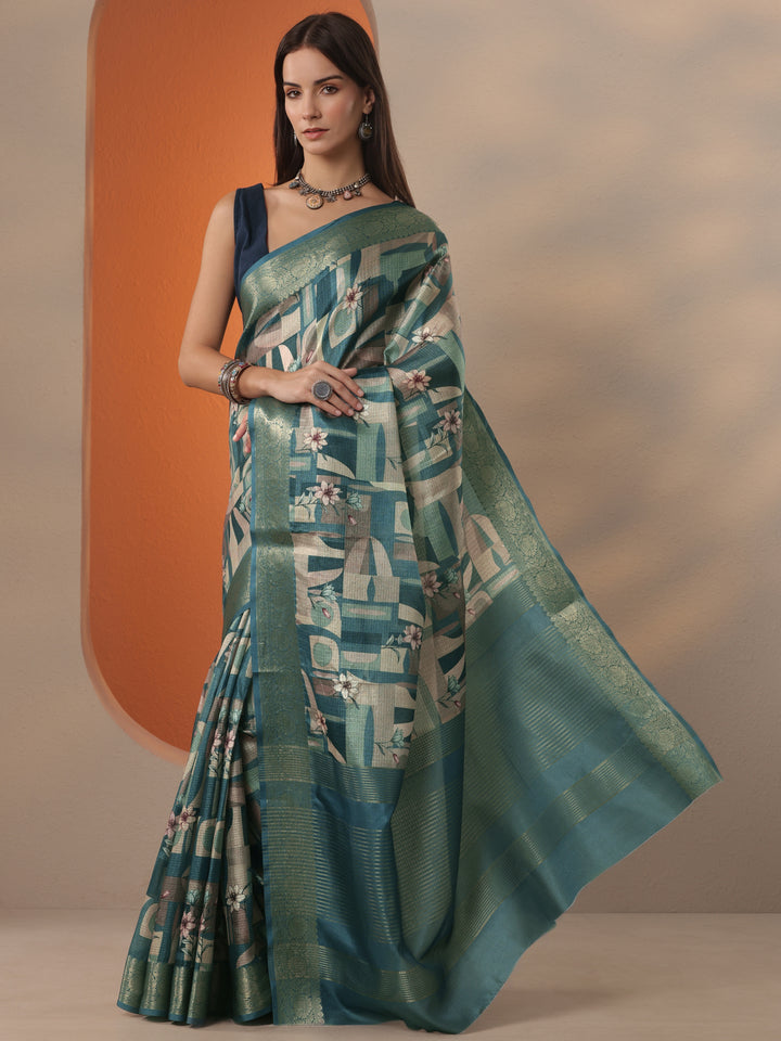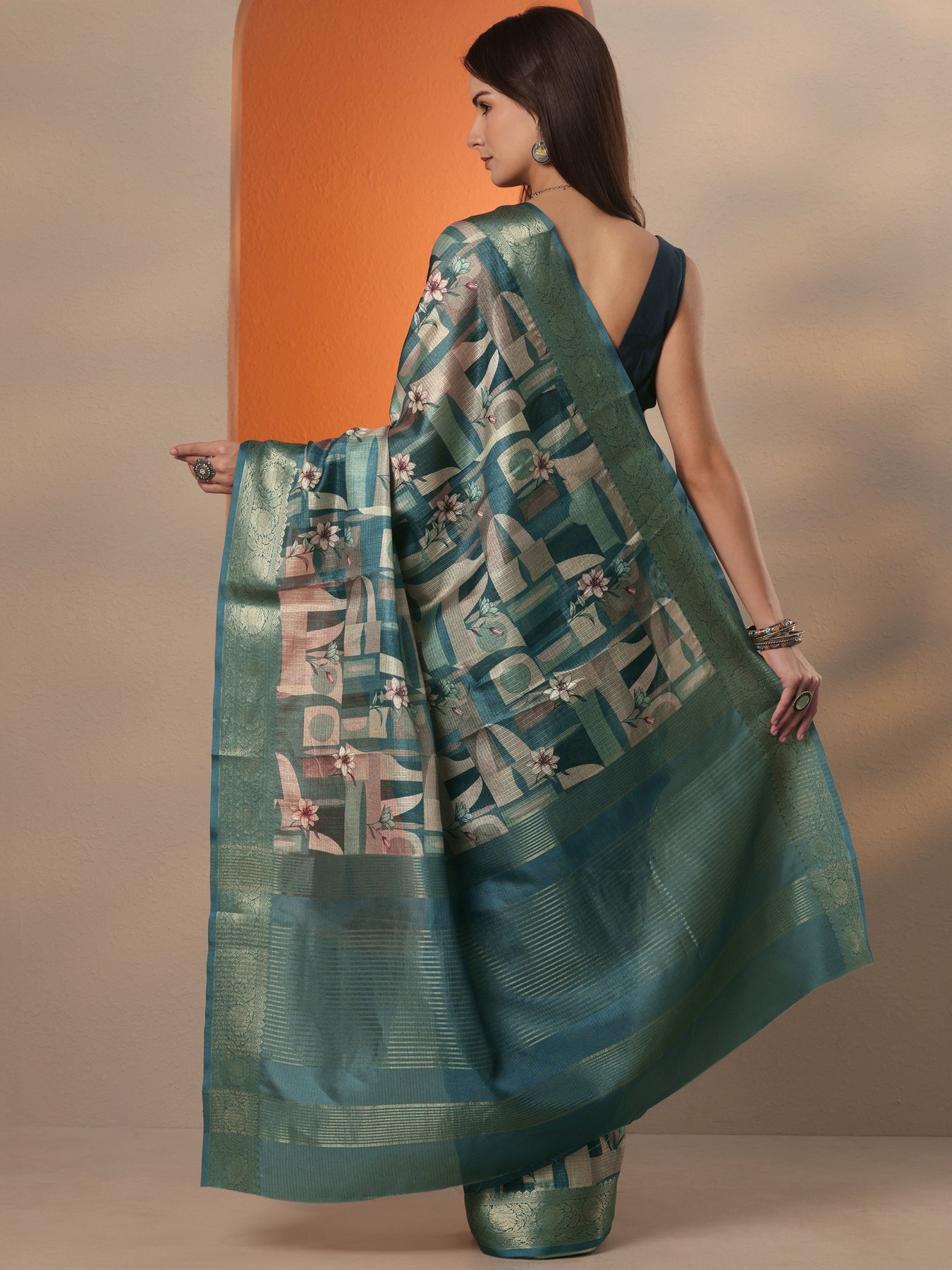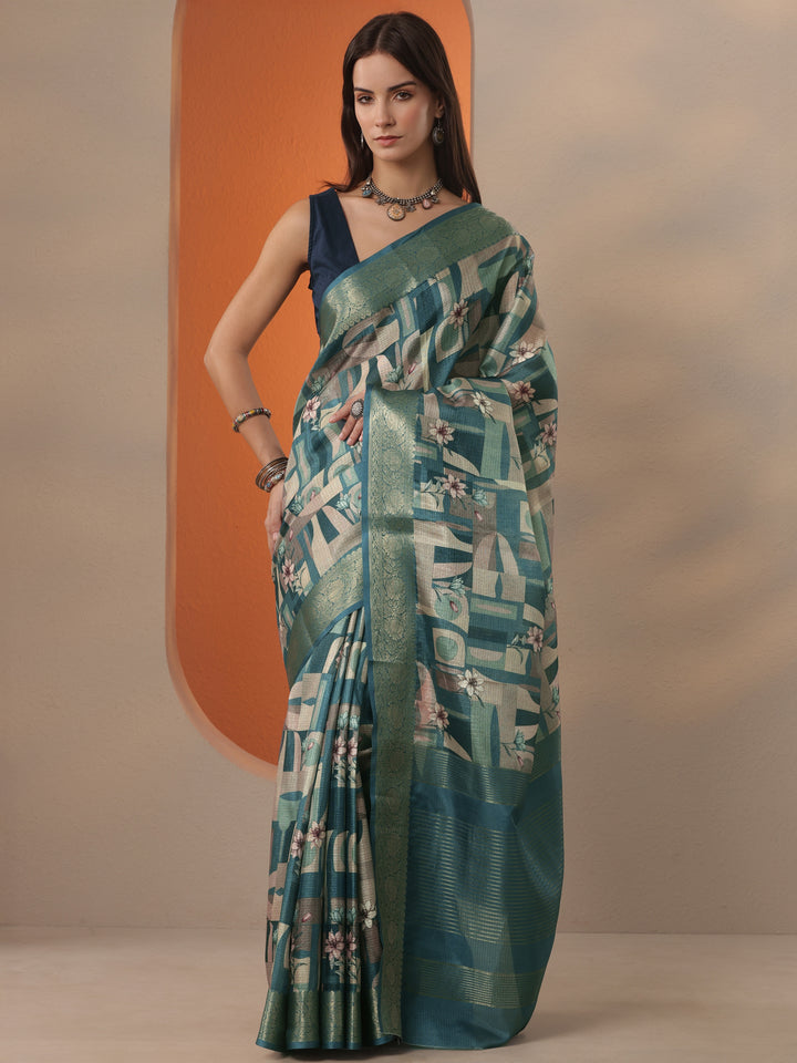 Teal Printed Kota Saree With Unstitched Blouse Piece