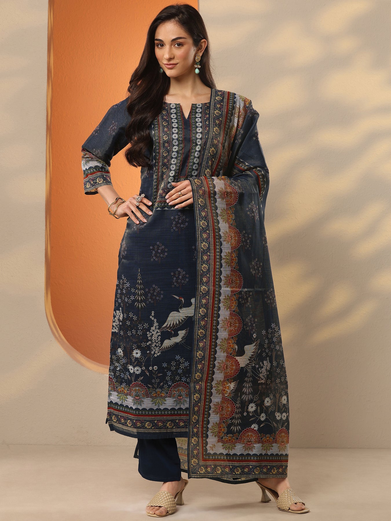 Navy Blue Printed Silk Blend Straight Suit Set With Dupatta