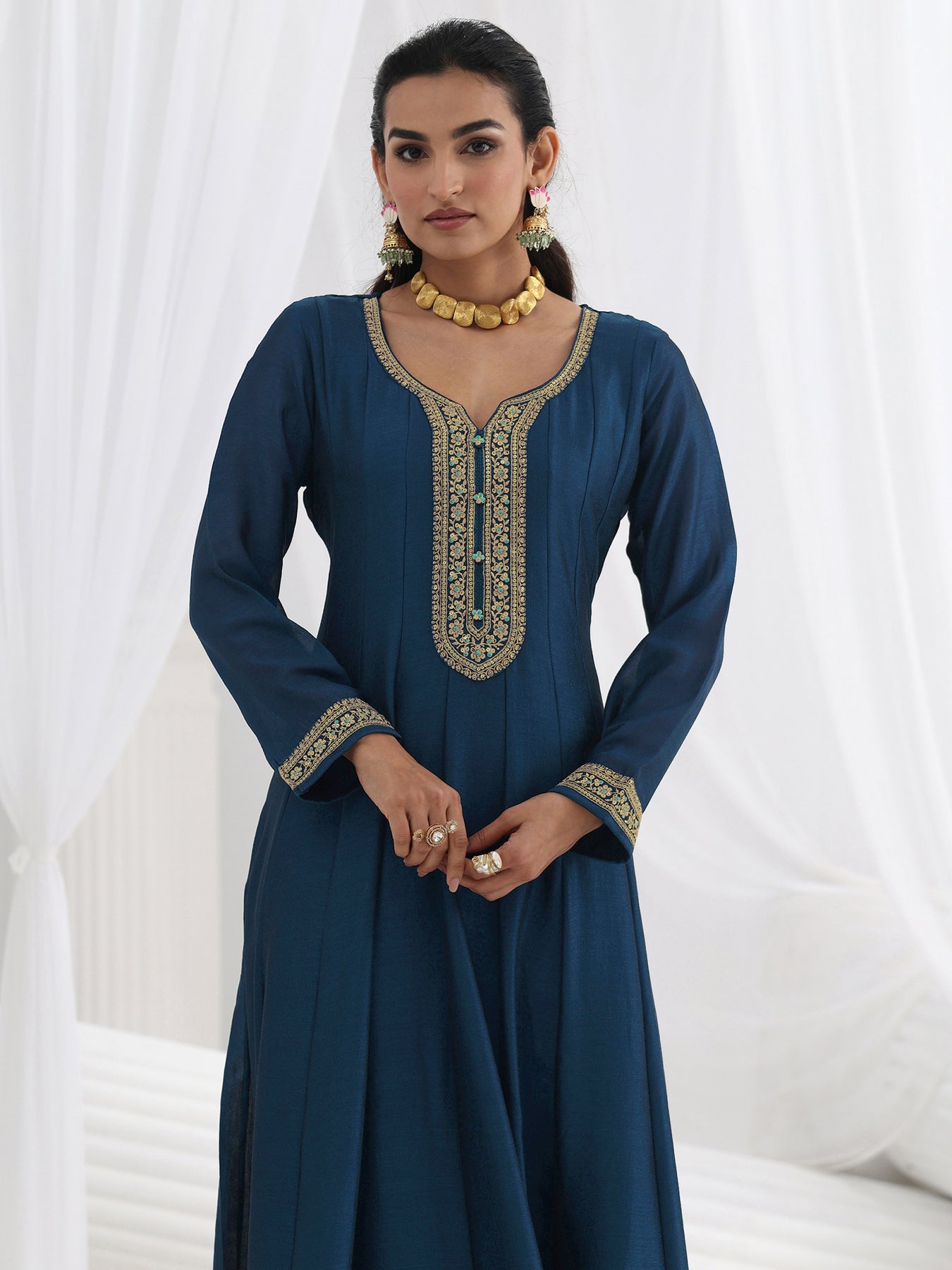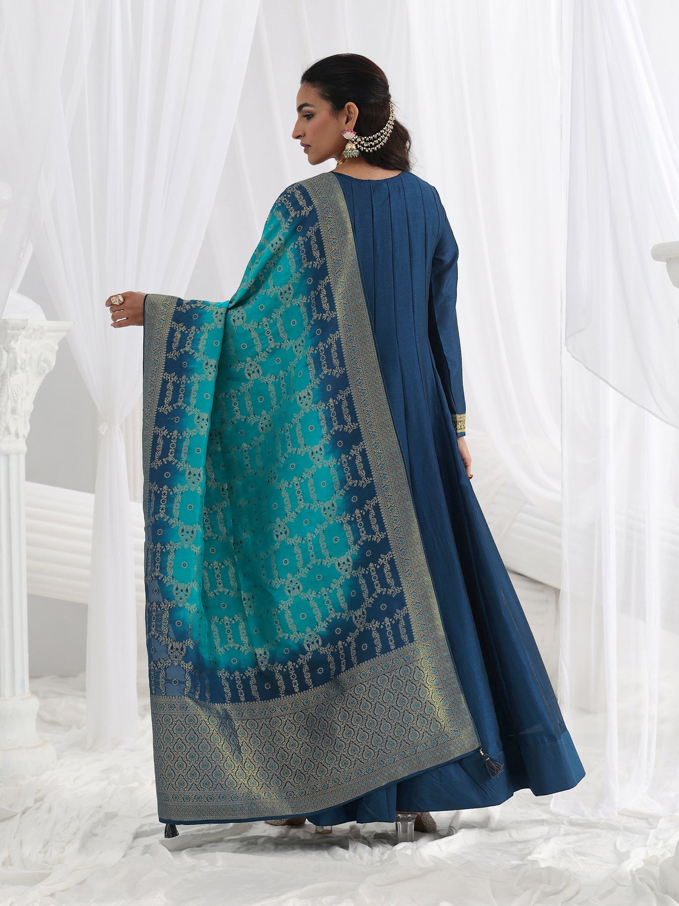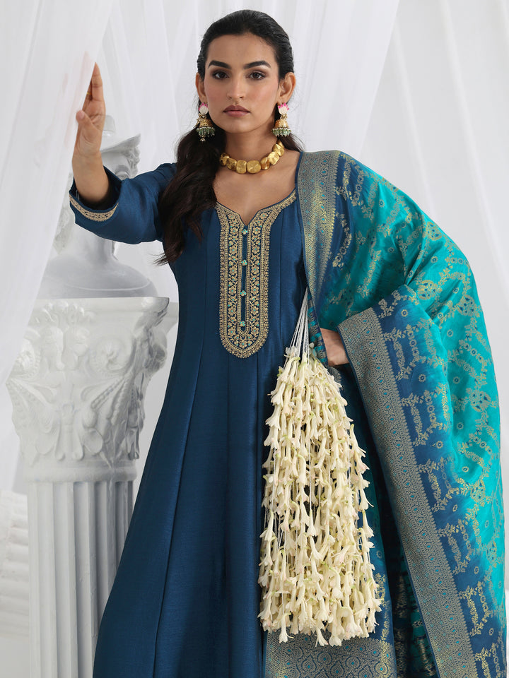 Navy Blue Embroidered Silk A-Line Gown With Dupatta