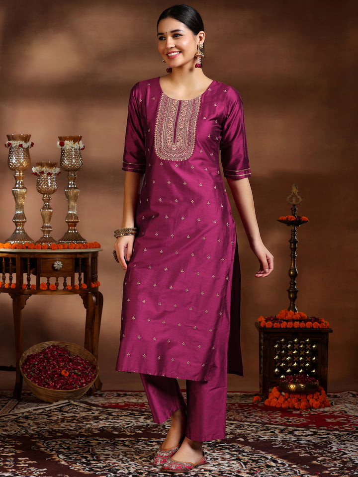 Pink Embroidered Silk Blend Straight Suit With Dupatta